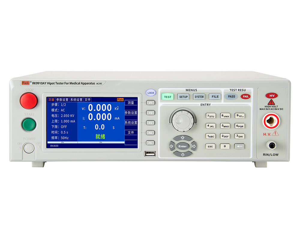 并具有软件校准功能,配备PLC接口、RS232C、RS485、USB device、USB Host接口,可方便与计算机或PLC组成综合测试系统。 RK99系列程控医用耐压测试仪具有常规耐压测试仪所有功能外,